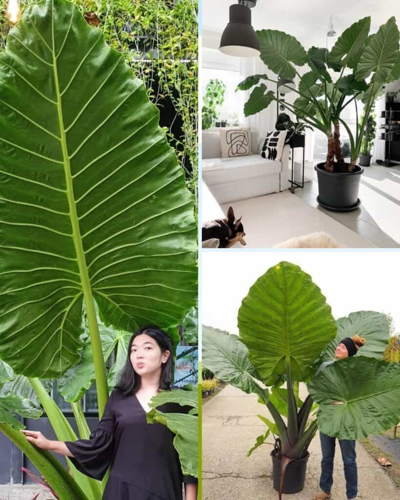He Alocasia macrorrhizos It is the best option for huge leaves. Its foliage can reach 3′ to 4′ long. Colocasia esculenta, also known as taro, is another option for large leaves. This variety is widely grown and can develop impressive foliage.