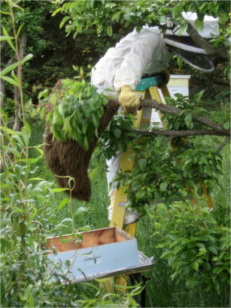 The queens are too heavy to fly long distances, so the swarm usually forms on a nearby structure or tree branch with the queen in the center, and the scout bees will begin looking for new homes. They group together in the chosen location for a few hours or a few days, until the scout bees determine where the final nest will be. Since I am on the swarm contact list for my area, I receive many frantic calls from concerned homeowners who have a swarm in a nearby bush, tree or other structure. I usually ask them to send me a photo of the swarm and give me a brief description of how accessible it will be before I commit to capturing it. But I have gathered some nice swarms of owners who are happy to get rid of them!